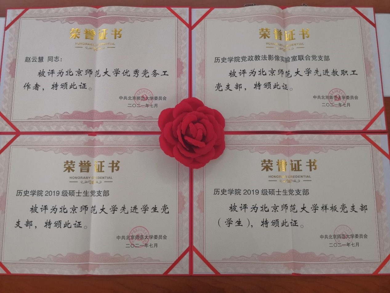 2021年6月28日下午,北京师范大学隆重召开庆祝中国共产党成立100周年暨表彰大会。经基层党组织推荐,校评审委员会评审,校党委常委会研究决定,最终确定受表彰单位人员名单。我院在本次表彰活动中成绩突出,荣获集体及个人多项荣誉。晁福林、郑林、胡小溪、夏玉丽、彭紫荆、陈力文、李硕晗荣获“优秀共产党员”称号;李志英、赵云慧荣获“优秀党务工作者”称号;党政教法影像实验室联合党支部、2019级硕士生党支部荣获“先进党支部”称号;2019级硕士生党支部荣获“样板党支部(学生)”称号。