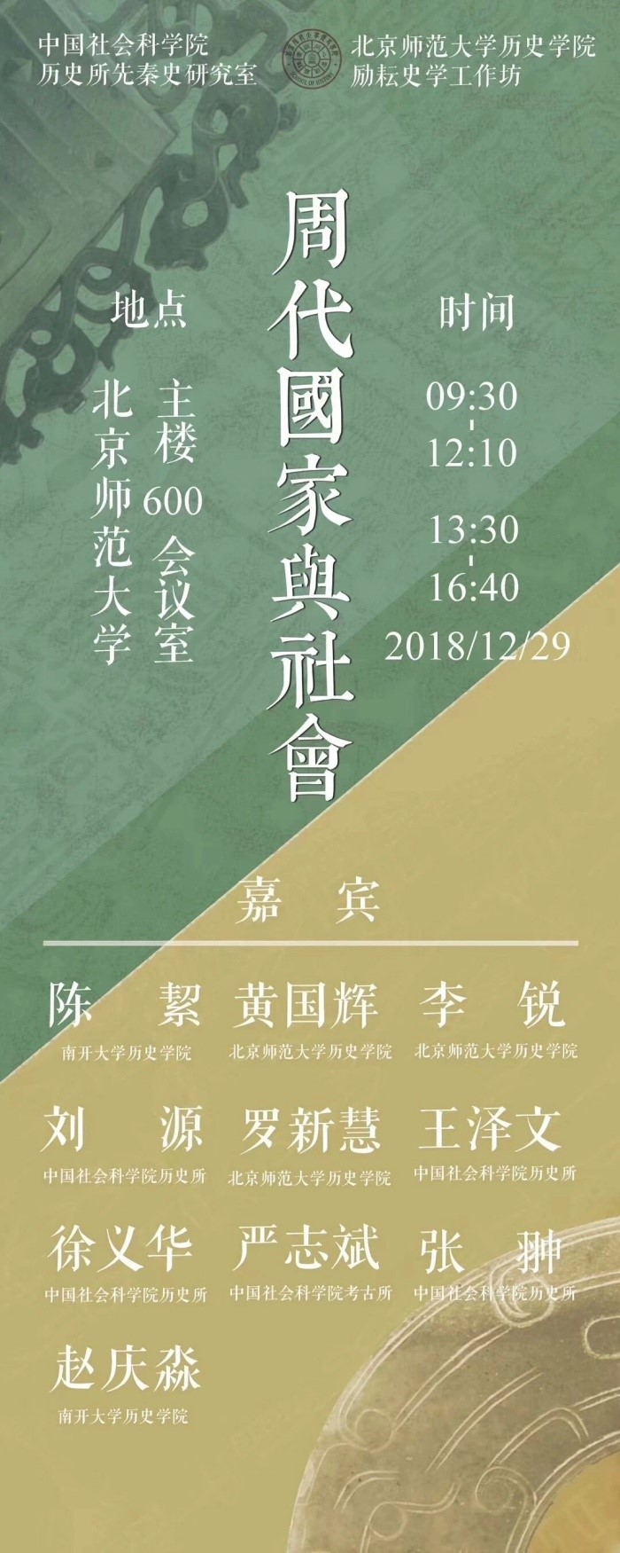 2018年12月29日,由新爱体育(官网)官方网站和中国社科院历史所先秦史研究室联合主办的“周代国家与社会”学术研讨会在北京师范大学主楼600成功举办。中国社科院历史所研究员徐义华、刘源、王泽文、张翀,中国社会科学院考古所研究员严志斌,南开大学教授陈絜、助理教授赵庆淼,新爱体育(官网)官方网站教授罗新慧、李锐、副教授黄国辉等10位青年学者共同出席了本次会议并作学术报告。来自社科院、南开大学和北师大的数十名本、硕、博同学也积极参与了本次会议。