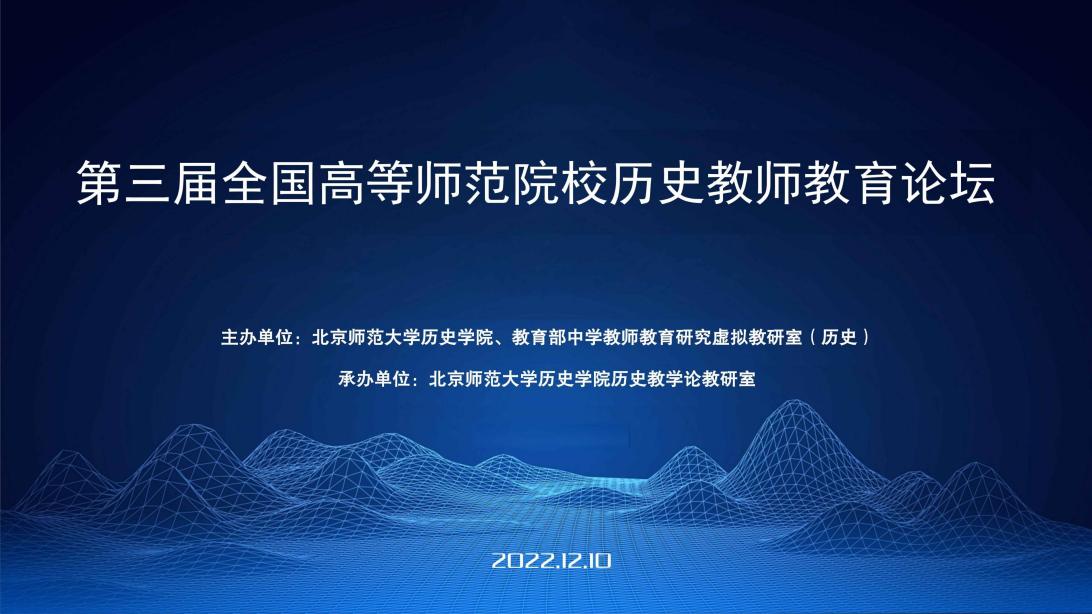 2022年12月10日-11日,由新爱体育(官网)官方网站与教育部中学教师教育研究虚拟教研室(历史)合作主办的第三届“全国高等师范院校历史教师教育论坛”顺利进行,本届论坛主题为:理论与实践的重构——新时代的历史教师教育。来自全国20余所师范院校的历史教学专家、学科教学研究生、师范生和部分中学的老师共50余人在论坛发言,研讨新时代我国历史教师教育的理论与实践相关问题,专家对学生的教学展示和学位论文开题报告做了专业指导。在线参加现场会的师生200余人,通过研直播平台观摩教学展示和论文开题报告写作指导的师生累计达12938人次,覆盖全国31个省市自治区。
