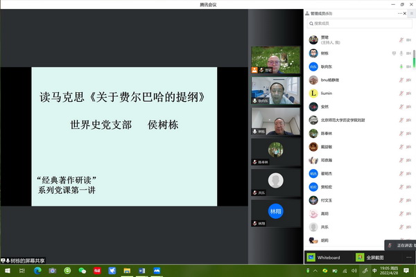 2022年4月28日,北师大历史学院世界史党支部“经典著作研读”系列党课如期开讲。第一讲由侯树栋老师主讲,题目是《读马克思<关于费尔巴哈的提纲>》。珠海校区的10余名师生党员在现场听课,北京校区的60余名师生党员通过视频会议的形式参加了学习。