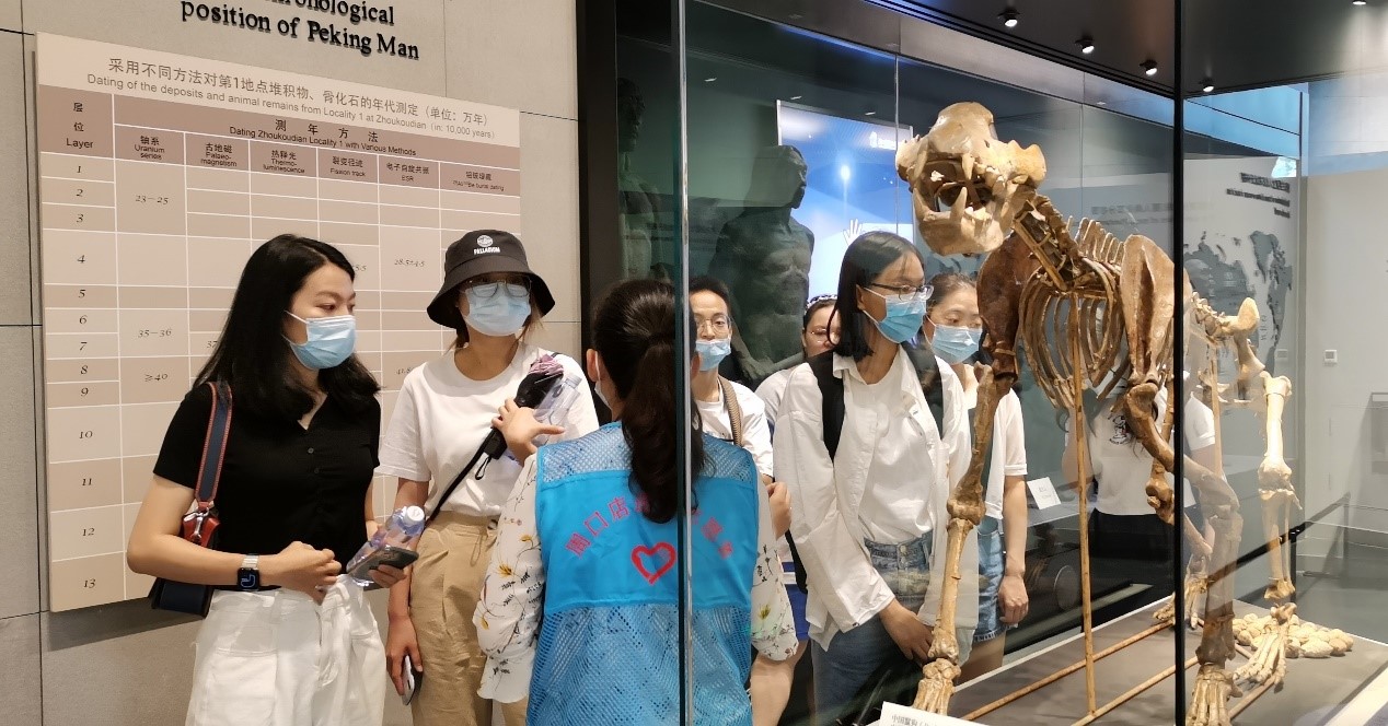 讲解志愿者在第三展厅、第四展厅中主要介绍了龙骨山上发现的二十余处脊椎动物化石遗址、古人类活动遗址分布点以及遗物。