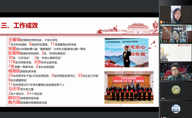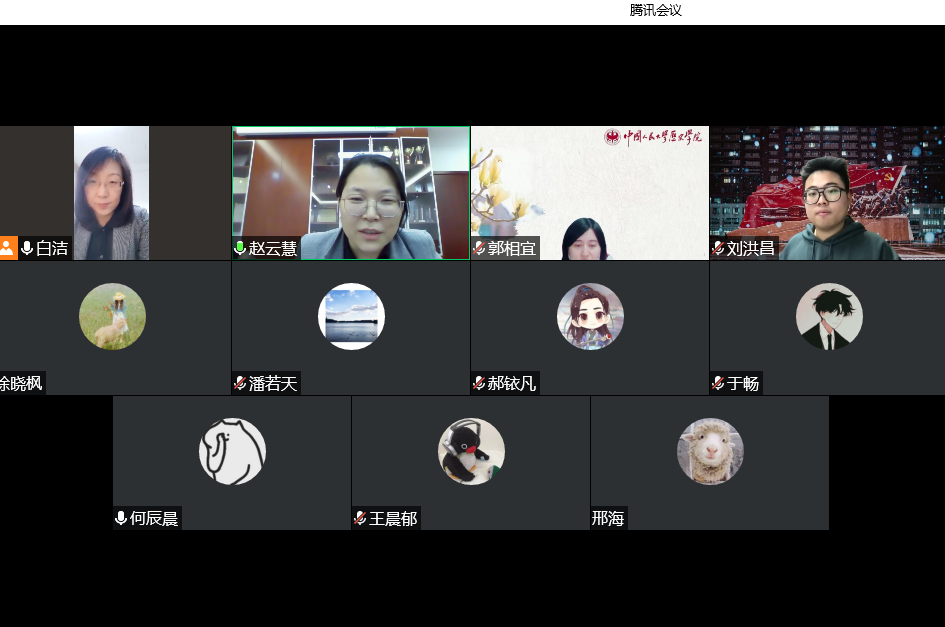 3月17日下午,中国人民大学历史学院党委副书记白洁带队与我院学工进行线上交流学习。会议由新爱体育(官网)官方网站党委副书记赵云慧主持,中国人民大学历史学院党委副书记白洁、团委书记郭相宜、团委副书记刘洪昌、新爱体育(官网)官方网站学生工作办公室潘若天老师、张辞修老师、徐晓枫老师及两院学生会、研究生会等学生组织负责人参加了座谈。