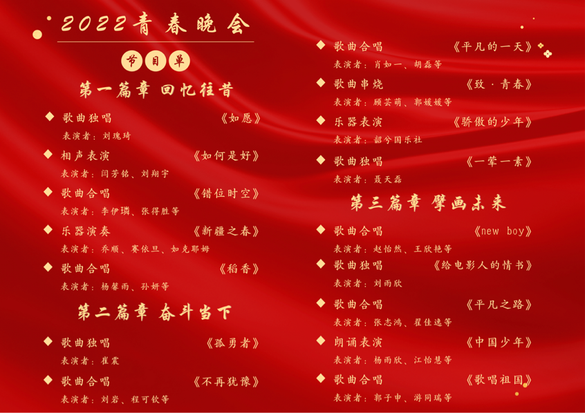 一首《如愿》拉开了晚会第一篇章“回忆往昔”的序幕。闫芳铭、刘翔宇同学的相声《如何是好》以生动活泼的表演让我们在欢笑中领略相声这种雅俗共赏的经典的魅力;李伊璘、凌可敬等同学共同演唱的歌曲《错位时空》,以悠扬的歌声,激励着同学们传承红色血脉,大步向前;在乔顺同学悠扬的小提琴声和两位同学优美的伴舞中,我们领略了新疆春天的光景;一曲《稻香》则表达了对童年无限的怀念。