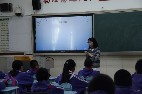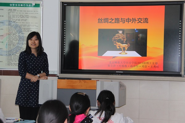 活动中,2014级硕士生党员王婷、华莉、游梦雨代表所在小组为初一(1)班同学作了题为《历史中的成语故事——春秋战国》的讲座。主讲人王婷结合春秋战国时期历史知识,为同学们讲解了有关楚庄王的成语一鸣惊人、问鼎中原以及有关毛遂的成语毛遂自荐、脱颖而出等。通过王婷生动的讲述,同学们对这些成语的源流和含义有了更为深刻的理解。2014级博士生党员宋文汐、孙中华、叶维维代表所在小组为高一(1)班同学作了题为《丝绸之路与中外文化交流》的讲座,她们利用地图、动态示意图、展览照片等影像材料向学生们介绍了丝绸之路的词源和概念,陆上和海上丝路的形成背景、过程和路线等基本内容,并重点介绍了通过丝绸之路,中外在物种、科技、文化习俗等方面的交流和融汇情况,使学生进一步了解到丝绸之路的重大历史意义和作用。