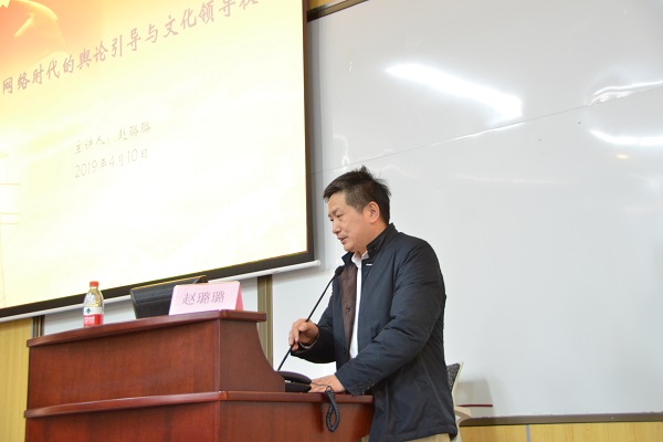 4月10日下午,历史学院二级党校在生一教室举办“网络时代的舆论引导与文化领导权”主题讲座。讲座由中共中央党校(国家行政学院)文史教研部副教授赵璐璐主讲,160余名历史学院学生党员和积极分子,以及外文学院学生入党积极分子参加了此次讲座。历史学院党委书记郭家宏主持讲座。