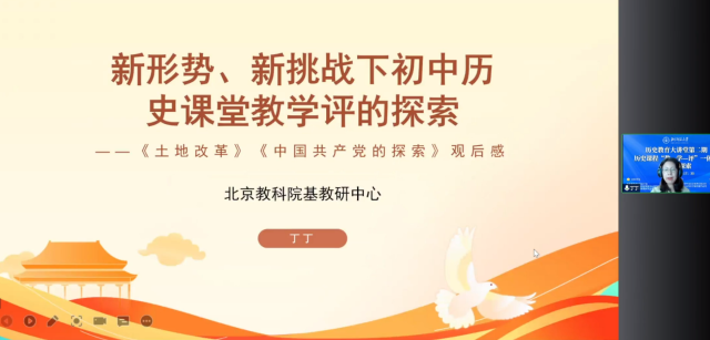 北京教育科学研究院历史教研员丁丁老师以“新形势、新挑战下初中历史课堂教学评的探索”为题,从教、学、评三个角度分别对高源和王鑫佩两位老师的课进行了细致的点评,并提出改进建议。