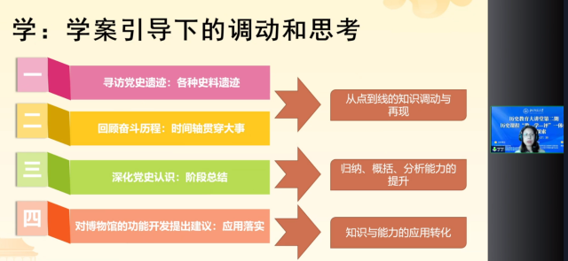 人大附中丰台学校王鑫佩老师展示复习课《共产党的探索历程(新民主主义革命时期》。在说课环节,王老师谈了自己使用评价量规的体会,认为针对活动设计的评价量规,有利于帮助学生随时调控、反思自己,提高课堂效率,涵养核心素养。北京教育学院丰台分院历史教研员曾晓玲老师结合本课内容,从确立科学合理的教学目标、设计落实目标的教学与评价活动两个方面进行了点评总结,强调教学和评价应以保障教学目标的实现为出发点和归宿。