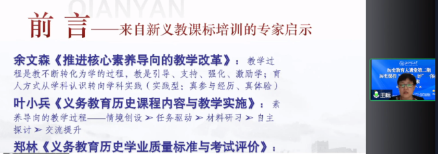 北京市教育科学研究院历史教研员王耘老师首先和大家分享了参加新义务教育课程标准国家级示范培训的体会,然后从育人方式定位、学科实践氛围、核心素养导向、学生成长外显四个方面,肯定了王宁老师和李洁云老师的课堂教学设计,同时从学法指导与实质性评价反馈、教师的思维指导等方面给两位老师提出切实可行的建议。