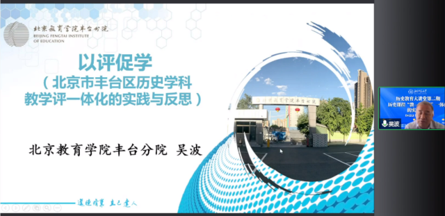 北京教育学院丰台分院历史教研员吴波老师以《以评促学——北京市丰台区历史学科教学评一体化的实践与反思》为题做主题讲座,介绍了近两年北京市丰台区历史教师在历史学科教学评一体化方面的实践探索,总结了在探索过程中的收获和反思,从重视评价的整体性规划、教学过程需要详略得当、围绕重点活动开展评价、依据具体学情开展评价、精细设计活动评价标准、强化学生的形成性反思、加强教师的针对性指导七个方面提出了改进设想。