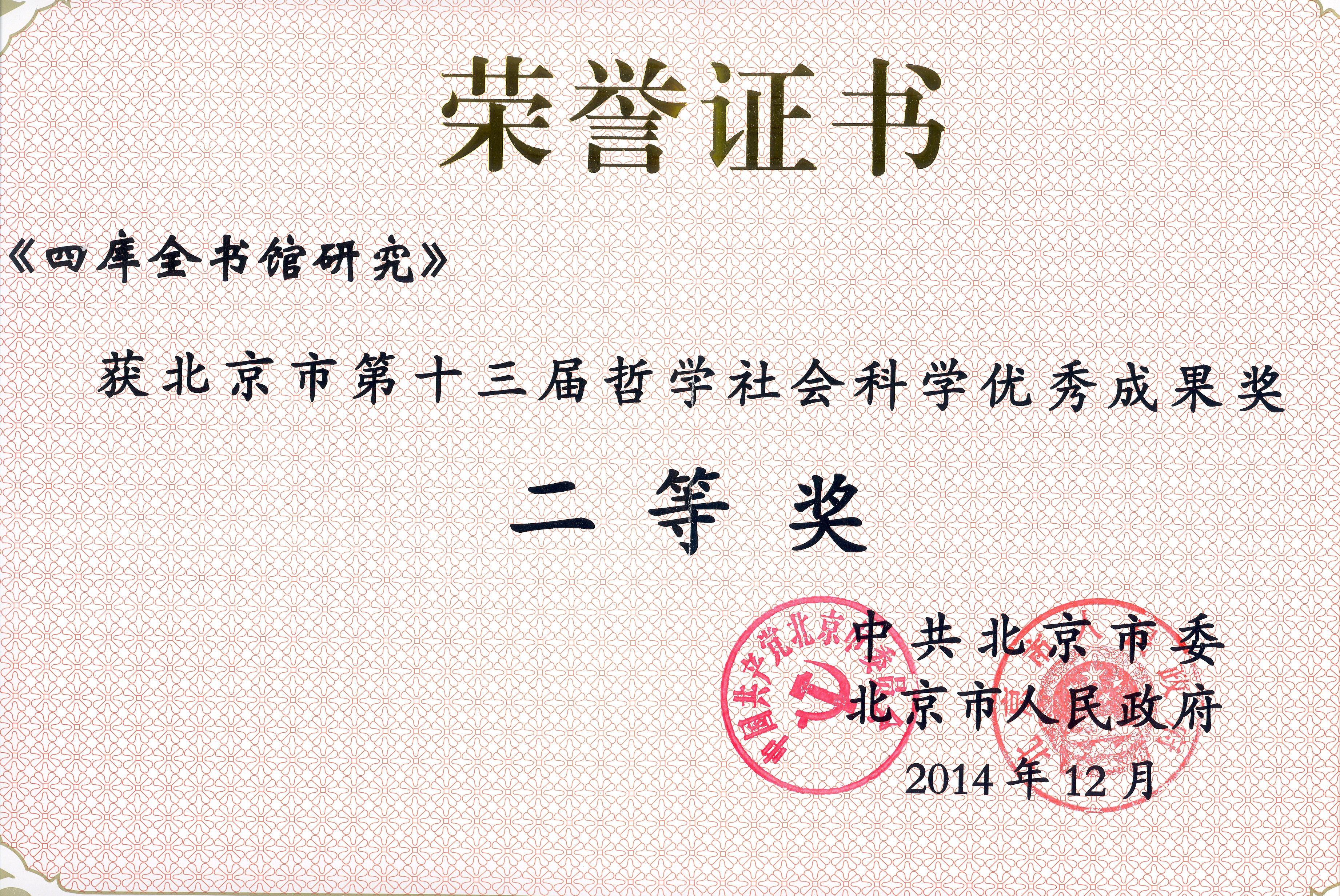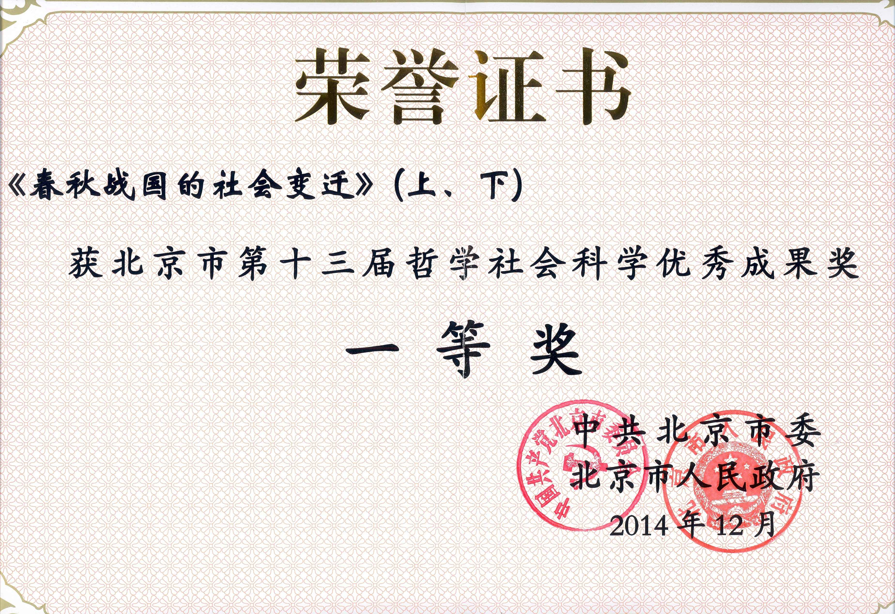 2015年1月8日,北京市第十三届哲学社会科学优秀成果奖颁奖仪式在我校举行,北京师范大学共获得22个项目奖项。其中我院教师占有3项。晁福林教授著作:《春秋战国的社会变迁(上、下)》获得一等奖。杨共乐教授著作:《早期丝绸之路的探微》和张升教授的著作:《四库全书馆研究》获得二等奖。