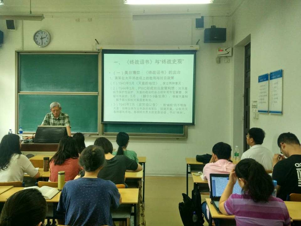 2017年6月29日上午,北京大学历史系宋成有教授应邀来到新爱体育(官网)官方网站研究生课堂为我校研究生作了一场题为《“终战史观”评析:战后日本右翼历史观揭底》的学术讲座,参加聆听讲座的40余位研究生、博士生和部分教师来自校内各个院系,还有来我校参加访学进修的其他兄弟院校的部分学者。
