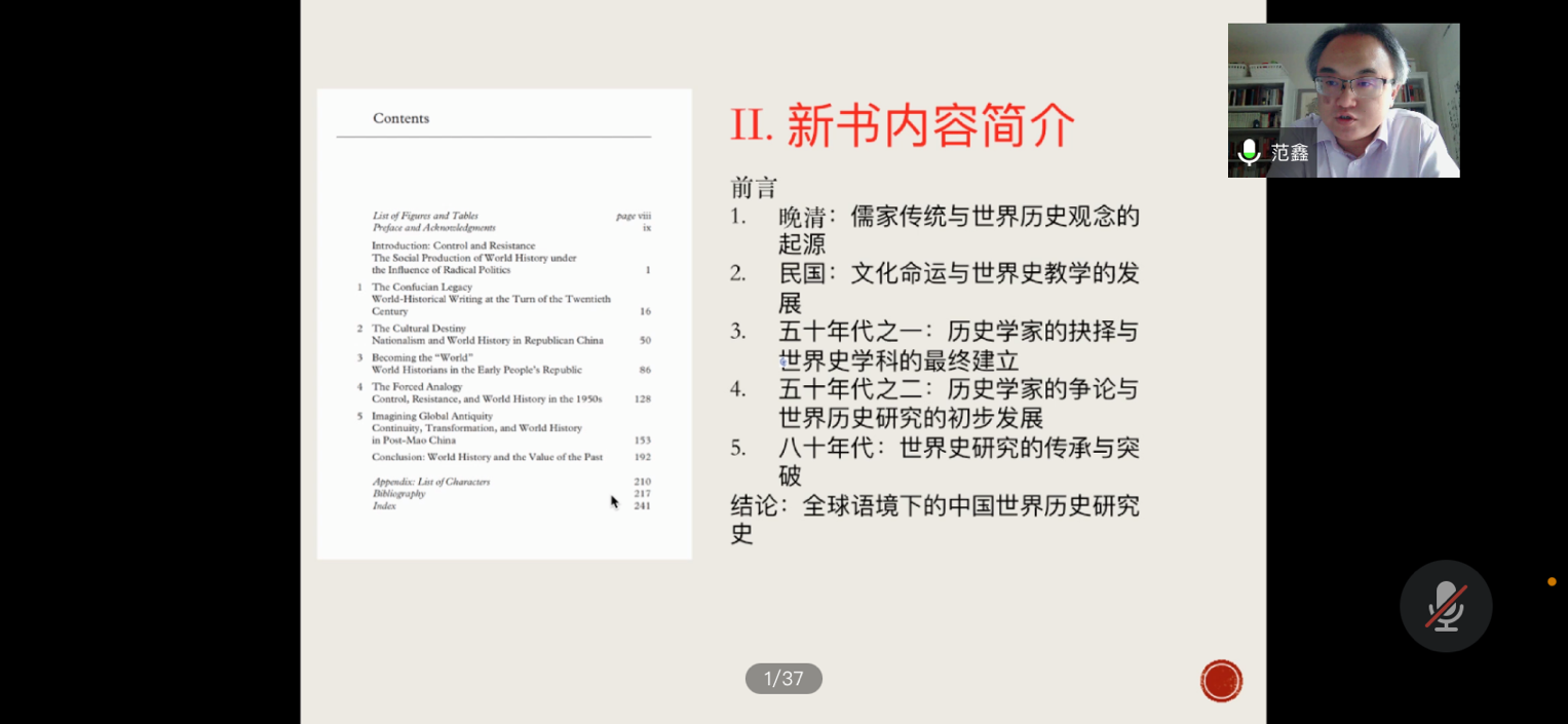 2021年5月16日晚,应我院倪滕达副教授的邀请,美国纽约州立大学弗雷多尼亚分校历史系范鑫副教授通过网络平台为师生们作了一场精彩的专题讲座。该讲座以“世界历史与中国认同”为主题,系“京师史学名家前沿系列讲座”之一。