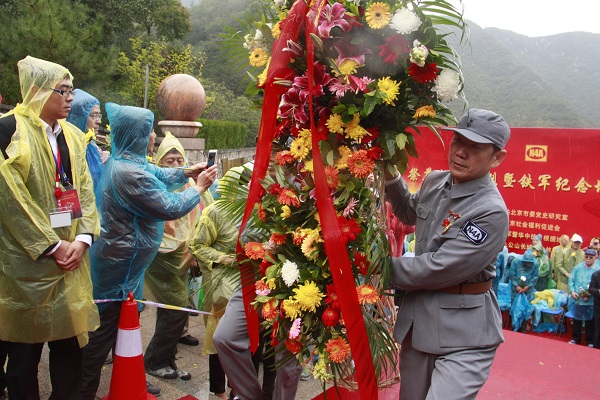 今年清明时节,为铭记新四军的丰功伟绩,铭记新四军将士的奋斗牺牲,铭记人民对子弟兵的养育恩情,北京新四军研究会组织多个寻访采集组,先后到湖北、江西、安徽、河南、江苏、浙江、广东、福建、湖南、上海、山东等11个省市的36处新四军抗日征战地,采集浸染着抗日英烈鲜血的红色热土,并决定将这些红色热土集中存放于北京九公山铁军纪念坛,以激励后人铭记历史,缅怀先烈,珍爱和平,开创未来。29日上午10时,“祭奠抗日英烈暨铁军纪念坛揭幕仪式”开始,来自社会各界的代表1000余人在雨中肃立,高唱国歌。在庄严肃穆的乐曲声中,新四军各分会代表怀着崇敬的心情,将存放着各地红色热土的青花瓷罐安放在铁军纪念坛中。