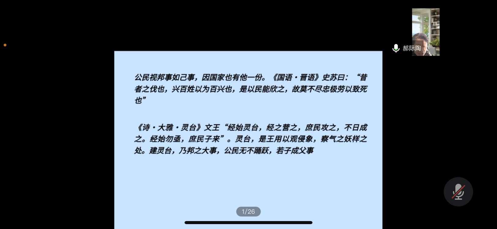 2020年10月23日上午,西方古典学家、华南师范大学教授郝际陶应我院邀请,通过网络平台为师生们作了一场精彩的专题讲座。该讲座以“古代城邦制刍议——从《雅典政制》与《周官》谈起”为主题,系“京师史学名家前沿系列讲座”之一,由我院世界上古中古史教研室倪滕达副教授主持,吸引了众多高校学生与历史爱好者前来聆听。