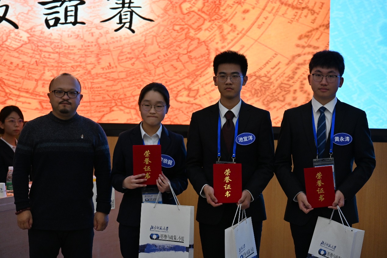 一番角逐过后,由北京师范大学文学院和历史学院2023级本科生组成的3号芝兰玉树代表队以4000分的成绩拔得头筹,国际关系学院2号观古知今代表队斩获亚军,国际关系学院1号正道沧桑代表队和北京师范大学4号含光却邪代表队获三等奖。来自国际关系学院文化传播系的孙浩翔和来自北京师范大学文学院的池宜洋在本次比赛中展现了深厚的时事功底和出色的表达能力,荣获“最佳风采奖”。
