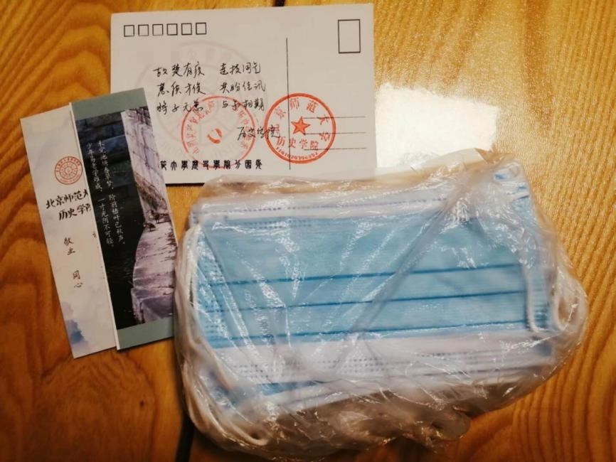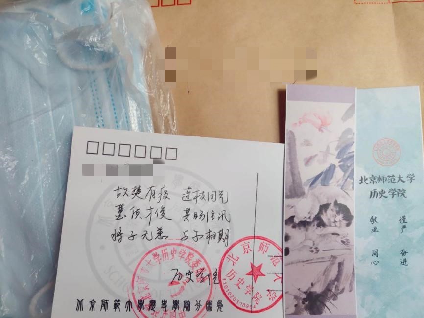 “故楚有疫,连枝同气。蕙质才俊,共盼佳讯。将子无恙,与尔相期。”3月7日女生节,历史学院师生撰写了为湖北人民加油打气的祝福语,表达了对湖北师生的关怀与牵挂。3月13日,中华儒学联合会赵毅武先生委托宁欣老师捐赠给学院口罩,学院将其转赠身处湖北地区的20名师生,一并寄往疫区的还有学院给每一位学生的寄语及书签。