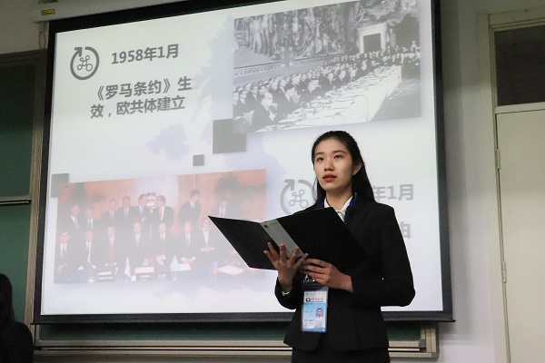 第一组代表、历史学院2018级王冰同学展示的主题是《英国脱欧——难以出鞘的双刃剑》。她向观众们娓娓道来,从英国脱欧的历史渊源讲到目前脱欧的主要进展与面临的困难,并以视频的形式展示了英国政府在脱欧问题上可能面临的四种情况。她指出:英国脱欧的背后既有传统孤立的价值观意识影响,又有当今盛行的民粹主义思潮推动;既有精英阶层的个人利益诉求在背后作祟,又有基层民众不理性的政治参与推波助澜,英国的未来最终只能由英国人自己决定,而回归理性才是解决问题的真正途径。该组展示融入了极富新意的情景剧,几位同学生动有趣的表演让观众们更加直观地理解了英国脱欧的困难之处,也使现场的气氛更加轻松愉快。