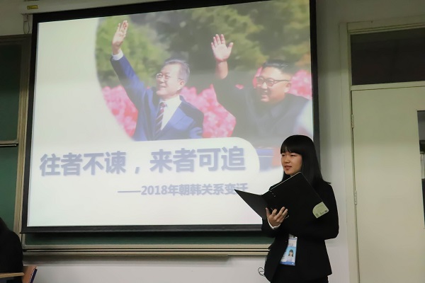 第二组代表、历史学院2018级余可绎同学以《往者不谏,来者可追——2018朝韩关系变迁》为题,详细地分析了使朝韩关系起起伏伏的各方面因素,并上升到东亚与国际局势的角度分析了朝韩关系缓和所带来的影响,最后表示:朝韩关系的和平之路仍需有关各方的共同努力,我们在等待炮声不再陡然响起,等待朝鲜半岛终战宣言发表,等待半岛和平真正到来的那一日!余可绎同学声情并茂的讲述令人动容。历史学院东亚史专家陈奉林老师对第二组进行点评,并从朝鲜、中国、美国等角度就朝鲜半岛问题作了一些补充。