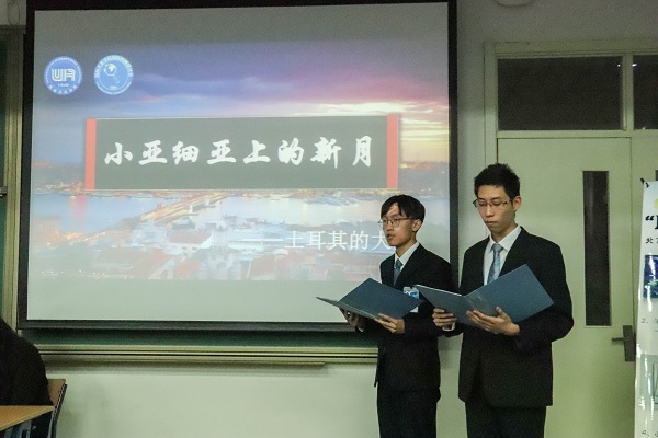 第三组由国际关系学院2018级顾锦东、钱芏涵同学进行展示,他们讲述的主题是《小亚细亚上的新月——土耳其的大国梦》。他们依次从“土耳其的历史剪影”、“强人埃尔多安的崛起”、“土耳其的2018”、“敢问路在何方”这四个模块着手,既回顾了土耳其的历史,又分析了当今的土耳其模式,还密切联系了与土耳其相关的热点问题,如卡舒吉案风波等,他们的讲稿结构清晰、文采飞扬,大气磅礴。历史学院世界近代史教研室贾珺老师在点评中指出:世界性的大国令人瞩目,而地区性的大国也同样值得关注。他肯定了该组同学对土耳其的历史与最新地区事件的系统梳理,以及对土俄、土美关系的叙述,同时提出希望同学们能尝试引入国际关系理论,使展示更加富有深度。