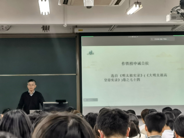 “中国古代史学经典选读”是面向文科类所有专业学生开设的一门史学基础课程。该课程围绕中国古代史学方面的重要作者、重要著作、重要文章来选取阅读材料,通过讲授这些文献材料,以期让学生初步了解中国古代史学经典、代表性文章,以及提升学生的古文阅读水平。课内容散点多,难度大,如何将知识点贯穿在文本讲解中值得青年教师们学习。本节课上张升老师在选取了《明实录·作铁榜申诫公侯》这一篇文献进行讲解。张升老师首先对题目进行了深入讲解,随后系统介绍了文献的历史背景,内容,编纂过程,实录与起居注的关系,如果引用查找文献等内容。课上学生互动热烈,体现出张升老师精心的课堂设计。