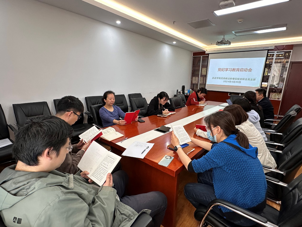 为深入学习贯彻习近平总书记关于党纪学习教育的重要讲话和重要指示精神,按照学校和学院统一安排,4月30日,历史学院党政教法影像实验室联合党支部开展专题学习,组织支部党员学习新修订的《中国共产党纪律处分条例》,支部全体党员参加。