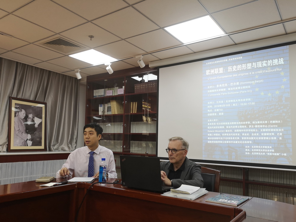 2019年6月19日下午,法国著名历史学家、索邦大学荣休教授、法国海外科学院院士巴尔若(Dominique Barjot)应邀到访我院,并以“欧洲联盟:历史的形塑与现实的挑战”为主题,在主楼743会议室为师生作了一场精彩的专题讲座。